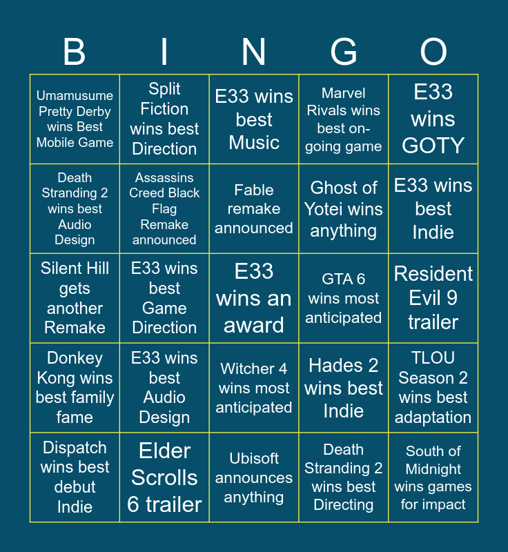 This bingo card has a free space and 69 words: God of War 3 Revealed, Resident Evil 9 trailer, FF7R Part 3 Revealed, New Larian Game, Elder Scrolls 6 trailer, Star Wars MMO announced, Marvel Rivals wins best on-going game, Death Stranding 2 wins GOTY, E33 wins GOTY, E33 actor wins best performance, TLOU Season 2 wins best adaptation, Cyberpunk 2 revealed, Umamusume Pretty Derby wins Best Mobile Game, E33 wins best Music, Lost Records wins Games For Impact, E33 wins best Game Direction, Witcher 4 wins most anticipated, Ghost of Yotei wins anything, E33 wins best RPG, Donkey Kong wins best family fame, GTA 6 wins most anticipated, Hades 2 wins best Indie, E33 wins best Indie, E33 wins best Art, Silksong wins best Indie, Silksong wins GOTY, KCD2 wins best RPG, Hades 2 wins best action game, Death Stranding 2 wins best Directing, Split Fiction wins best Multiplayer, Split Fiction wins best Direction, Hades 2 wins best Direction, E33 wins best narrative, DS2 wins best narrative, Silksong wins best Music, Hades 2 wins best Music, Death Stranding 2 wins best Music, Battlefield 6 wins best Audio Design, Death Stranding 2 wins best Audio Design, Silent Hill f wins best audio Design, E33 wins best Audio Design, South of Midnight wins games for impact, Non-E33 actor wins best performance, WuWa wins best mobile game, E33 wins best debut Indie, Dispatch wins best debut Indie, Half Life 3, Portal 3, New Kojima game trailer, Assassins Creed Black Flag Remake announced, Fable remake announced, FromSoftware announces anything, ANY Nintendo trailer, Ubisoft announces anything, New Tomb Raider announced, Littlebigplanet revival, Mass Effect Revival, Star Wars Jedi 3, Control 2, Silent Hill gets another Remake, New Square Enix RPG, Final Fantasy 17, Fallout remake or new game, Kingdom Hearts 4 trailer, New Gacha game, More cozy games announced than can count, Lego Batman trailer, New IP from Sony and New IP from XBOX.