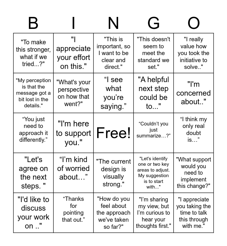 This bingo card has a free space and 24 words: “I’m kind of worried about…”, “Thanks for pointing that out.”, “I see what you’re saying.”, "I'd like to discuss your work on ..", "I really value how you took the initiative to solve..", "To make this stronger, what if we tried...?", "My perception is that the message got a bit lost in the details.", "I appreciate your effort on this.", “Couldn’t you just summarize…?”, "The current design is visually strong.", "A helpful next step could be to...", “You just need to approach it differently.”, "Let's identify one or two key areas to adjust. My suggestion is to start with...", "What support would you need to implement this change?", "What's your perspective on how that went?", "I’m sharing my view, but I’m curious to hear your thoughts first.", “I think my only real doubt is…”, "This is important, so I want to be clear and direct.", "I'm concerned about..", "I'm here to support you.", "I appreciate you taking the time to talk this through with me.", "Let's agree on the next steps. ", "This doesn't seem to meet the standard we set." and "How do you feel about the approach we've taken so far?".