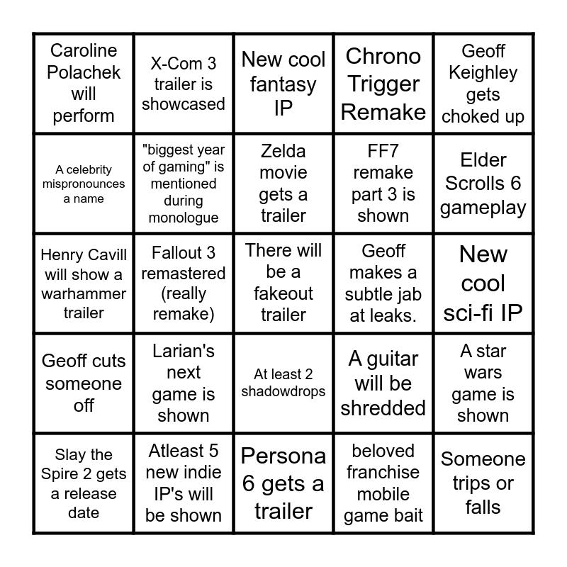 This bingo card has a free space and 24 words: Larian's next game is shown, Atleast 5 new indie IP's will be shown, Zelda movie gets a trailer, Slay the Spire 2 gets a release date, Geoff Keighley gets choked up, Caroline Polachek will perform, A celebrity mispronounces a name, X-Com 3 trailer is showcased, Geoff makes a subtle jab at leaks., At least 2 shadowdrops, FF7 remake part 3 is shown, Henry Cavill will show a warhammer trailer, A guitar will be shredded, A star wars game is shown, "biggest year of gaming" is mentioned during monologue, beloved franchise mobile game bait, New cool sci-fi IP, New cool fantasy IP, Elder Scrolls 6 gameplay, Fallout 3 remastered (really remake), Someone trips or falls, Geoff cuts someone off, Chrono Trigger Remake and Persona 6 gets a trailer.