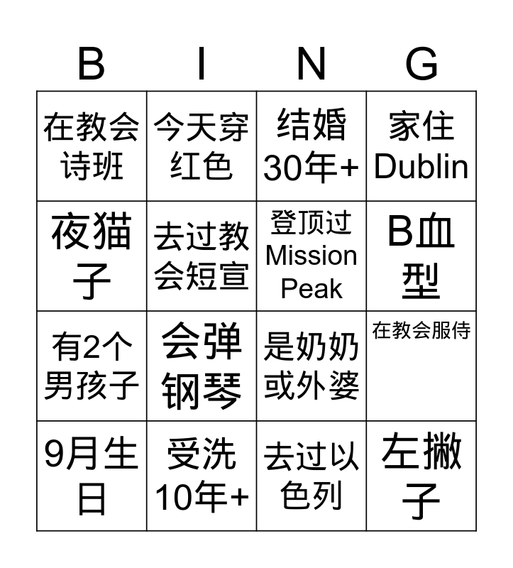 This bingo card has 20 words: 在教会服侍, 慕道友, 结婚30年+, 50岁以下, 9月生日, 夜猫子, 受洗10年+, 在教会诗班, 有2个男孩子, 今天穿红色, 会弹钢琴, 是奶奶或外婆, 去过教会短宣, 左撇子, 登顶过Mission Peak, 这个学期才来的新人, B血型, 家住Dublin, 去过以色列 and 喜欢滑雪.