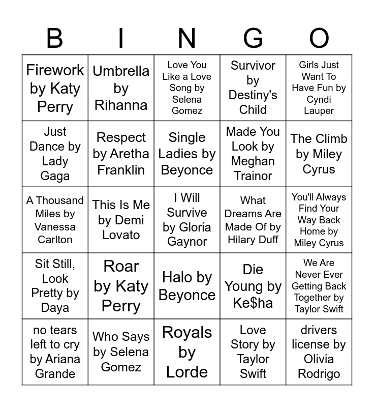 This bingo card has 39 words: Dancing Queen by ABBA, Girl on Fire by Alicia Keys, Walking on Sunshine by Aly & AJ, Respect by Aretha Franklin, no tears left to cry by Ariana Grande, Halo by Beyonce, Single Ladies by Beyonce, Call Me Maybe by Carly Rae Jepsen, Girls Just Want To Have Fun by Cyndi Lauper, Sit Still, Look Pretty by Daya, This Is Me by Demi Lovato, Survivor by Destiny's Child, I Will Survive by Gloria Gaynor, You'll Always Find Your Way Back Home by Miley Cyrus, What Dreams Are Made Of by Hilary Duff, Roar by Katy Perry, Teenage Dream by Katy Perry, Firework by Katy Perry, Since U Been Gone by Kelly Clarkson, Die Young by Ke$ha, Just Dance by Lady Gaga, Royals by Lorde, Made You Look by Meghan Trainor, The Climb by Miley Cyrus, Party In The U.S.A. by Miley Cyrus, Pocketful of Sunshine by Natasha Bedingfield, drivers license by Olivia Rodrigo, Hit Me With Your Best Shot by Pat Benatar, Fight Song by Rachel Platten, Umbrella by Rihanna, Brave by Sara Bareilles, Love Song by Sara Bareilles, Love You Like a Love Song by Selena Gomez, Who Says by Selena Gomez, Love Story by Taylor Swift, You Belong With Me by Taylor Swift, We Are Never Ever Getting Back Together by Taylor Swift, A Thousand Miles by Vanessa Carlton and I Wanna Dance With Somebody by Whitney Houston.