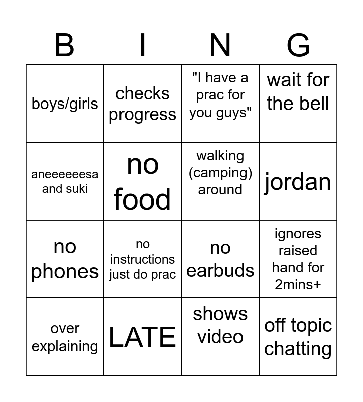 This bingo card has 25 words: calls someone full name, stile app, jordan, seating plan, aneeeeeesa and suki, boys/girls, no food, checks progress, LATE, detention, no phones, no earbuds, sit and scroll for 5mins+, standing at back of class, walking (camping) around, no teaching, shows video, "I have a prac for you guys", no instructions just do prac, ignores raised hand for 2mins+, over explaining, laptops down, off topic chatting, wait for the bell and george du accent.