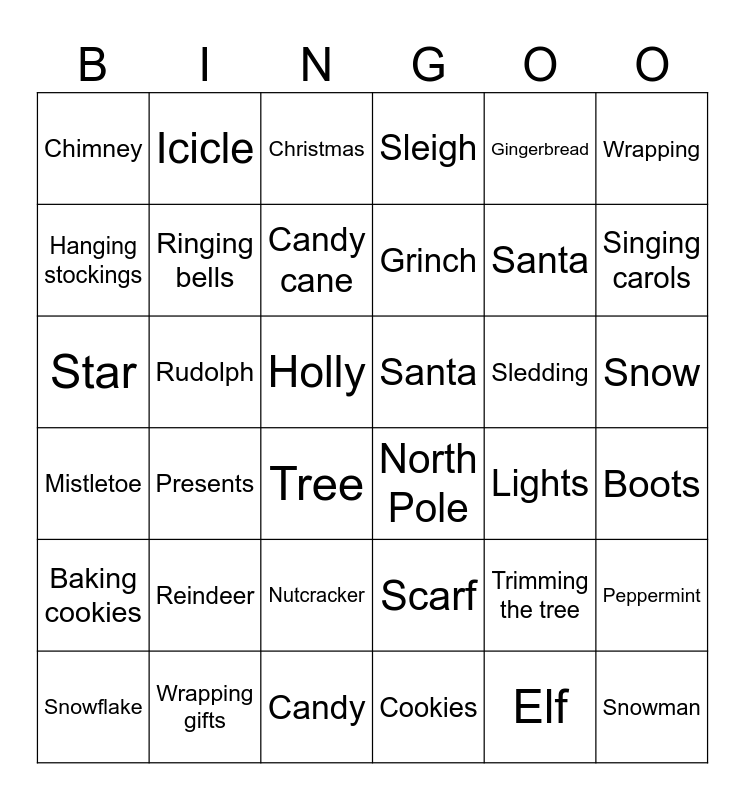 This bingo card has 54 words: Free!, Santa, Elf, Reindeer, Snow, Snowman, Sleigh, Present, Wrapping, Stocking, Chimney, Cookies, North Pole, Tree, Ornament, Lights, Star, Candy cane, Gingerbread, Holly, Mistletoe, Nutcracker, Rudolph, Gingerbread, Snowball, Icicle, Snowflake, Mittens, Scarf, Boots, Sled, Candy, Ribbon, Bow, Christmas, Elf, Santa, Presents, Baking cookies, Hanging stockings, Decorating tree, Untangling lights, Building a snowman, Drinking cocoa, Sledding, Shopping, Wrapping gifts, Trimming the tree, Ringing bells, Singing carols, Grinch, Sleigh bells, Peppermint and Candy shop.