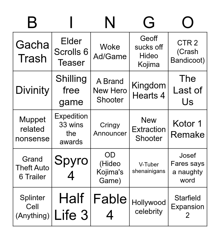 This bingo card has a free space and 24 words: Spyro 4, Half Life 3, A Brand New Hero Shooter, Splinter Cell (Anything), CTR 2 (Crash Bandicoot), Gacha Trash, Divinity, Elder Scrolls 6 Teaser, New Extraction Shooter, OD (Hideo Kojima's Game), Kingdom Hearts 4, Muppet related nonsense, V-Tuber shenainigans, Josef Fares says a naughty word, Shilling free game, Hollywood celebrity, Kotor 1 Remake, Woke Ad/Game, The Last of Us, Expedition 33 wins the awards, Starfield Expansion 2, Grand Theft Auto 6 Trailer, Geoff sucks off Hideo Kojima and Fable 4.