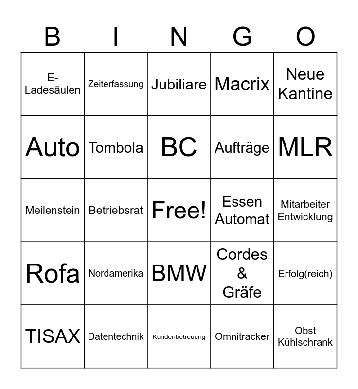This bingo card has a free space and 24 words: TISAX, Nordamerika, BC, Omnitracker, Neue Kantine, E-Ladesäulen, Zeiterfassung, Jubiliare, Essen Automat, Mitarbeiter Entwicklung, Meilenstein, Tombola, Cordes & Gräfe, Erfolg(reich), Auto, Datentechnik, Kundenbetreuung, Macrix, MLR, Rofa, Betriebsrat, BMW, Aufträge and Obst Kühlschrank.
