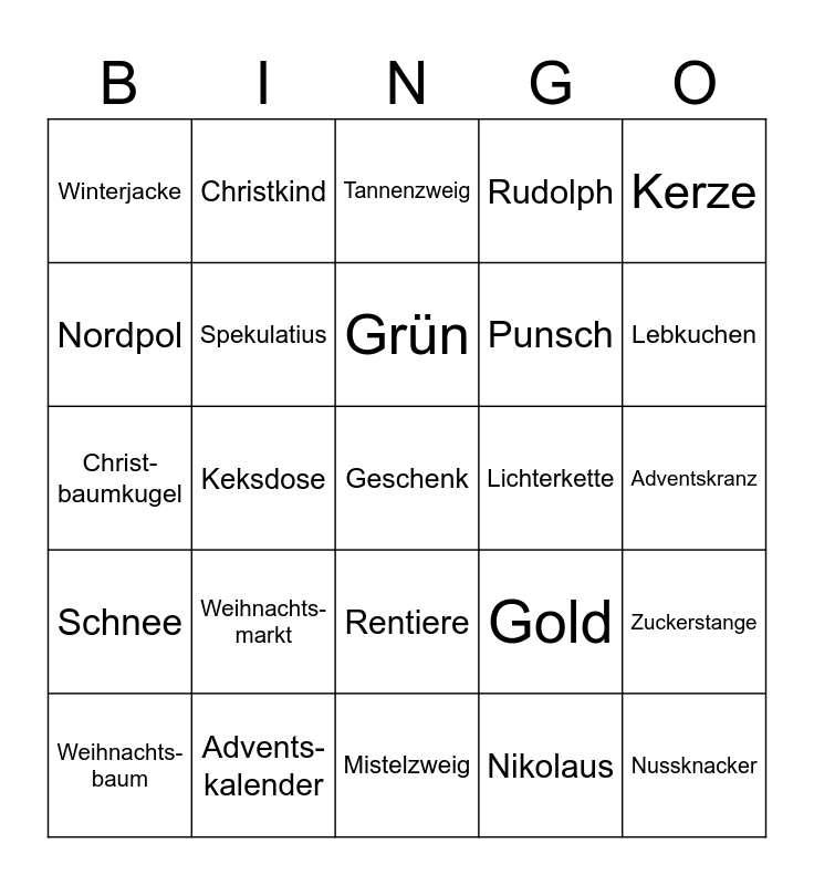 This bingo card has 43 words: Weihnachten, Geschenk, Schneemann, Weihnachts-baum, Glühwein, Nikolaus, Tannenzweig, Plätzchen, Kerze, Advents-kalender, Rudolph, Lichterkette, Rentiere, Weihnachts-markt, Schokolade, Mistelzweig, Heiligabend, Christ-baumkugel, Zimtgeruch, Lebkuchen, Christkind, Schneeflocke, Weihnachts-mann, Winterjacke, Engel, Adventskranz, Zimt, Rot, Gold, Schnee, Stern, Zuckerstange, Frost, Keksdose, Wichtel, Bratapfel, Nussknacker, Grün, Nordpol, Punsch, Weihnachts-pulli, Spekulatius and Marzipan.
