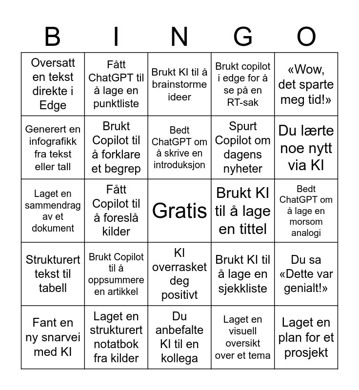 This bingo card has a free space and 24 words: Brukt Copilot til å oppsummere en artikkel, Laget en strukturert notatbok fra kilder, Bedt ChatGPT om å skrive en introduksjon, Fant en ny snarvei med KI, «Wow, det sparte meg tid!», Oversatt en tekst direkte i Edge, Generert en infografikk fra tekst eller tall, Fått ChatGPT til å lage en punktliste, Brukt KI til å lage en tittel, KI overrasket deg positivt, Spurt Copilot om dagens nyheter, Laget en sammendrag av et dokument, Brukt KI til å lage en sjekkliste, Du sa «Dette var genialt!», Brukt Copilot til å forklare et begrep, Laget en visuell oversikt over et tema, Bedt ChatGPT om å lage en morsom analogi, Brukt KI til å brainstorme ideer, Du lærte noe nytt via KI, Fått Copilot til å foreslå kilder, Laget en plan for et prosjekt, Strukturert tekst til tabell, Brukt copilot i edge for å se på en RT-sak and Du anbefalte KI til en kollega.