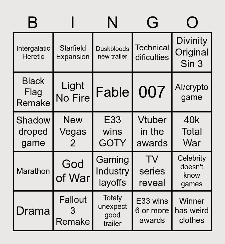 This bingo card has a free space and 24 words: God of War, Fallout 3 Remake, Fable, Drama, Divinity Original Sin 3, Intergalatic Heretic, Black Flag Remake, Starfield Expansion, Vtuber in the awards, Gaming Industry layoffs, 007, Shadow droped game, TV series reveal, Celebrity doesn't know games, Light No Fire, E33 wins 6 or more awards, 40k Total War, Duskbloods new trailer, AI/crypto game, New Vegas 2, Winner has weird clothes, Marathon, Technical dificulties and Totaly unexpect good trailer.