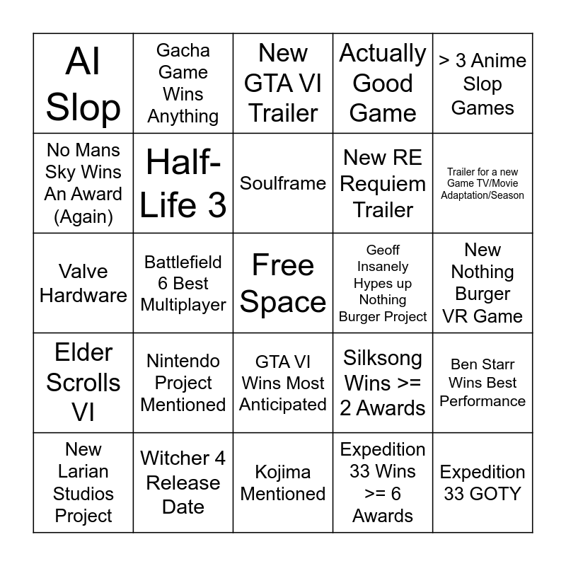 This bingo card has a free space and 24 words: New Larian Studios Project, Nintendo Project Mentioned, Soulframe, Expedition 33 Wins >= 6 Awards, > 3 Anime Slop Games, AI Slop, Gacha Game Wins Anything, New GTA VI Trailer, Geoff Insanely Hypes up Nothing Burger Project, New Nothing Burger VR Game, Valve Hardware, Half-Life 3, Silksong Wins >= 2 Awards, Ben Starr Wins Best Performance, No Mans Sky Wins An Award (Again), Witcher 4 Release Date, Kojima Mentioned, Actually Good Game, Trailer for a new Game TV/Movie Adaptation/Season, Elder Scrolls VI, Battlefield 6 Best Multiplayer, GTA VI Wins Most Anticipated, New RE Requiem Trailer and Expedition 33 GOTY.