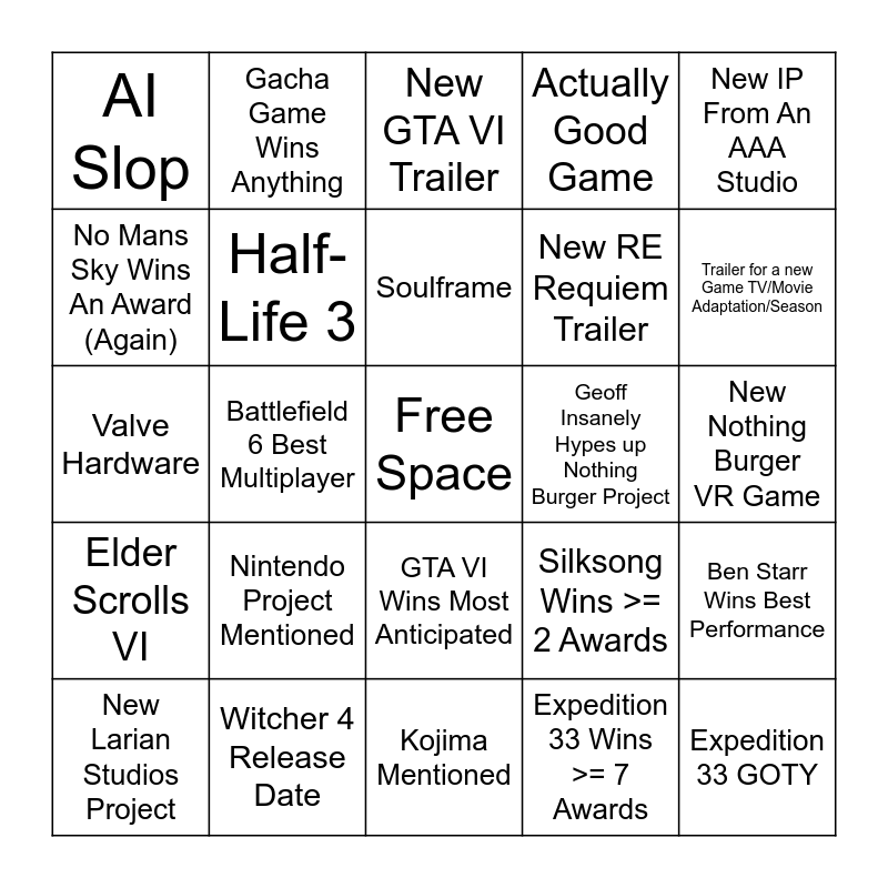 This bingo card has a free space and 24 words: New Larian Studios Project, Nintendo Project Mentioned, Soulframe, Expedition 33 Wins >= 7 Awards, New IP From An AAA Studio, AI Slop, Gacha Game Wins Anything, New GTA VI Trailer, Geoff Insanely Hypes up Nothing Burger Project, New Nothing Burger VR Game, Valve Hardware, Half-Life 3, Silksong Wins >= 2 Awards, Ben Starr Wins Best Performance, No Mans Sky Wins An Award (Again), Witcher 4 Release Date, Kojima Mentioned, Actually Good Game, Trailer for a new Game TV/Movie Adaptation/Season, Elder Scrolls VI, Battlefield 6 Best Multiplayer, GTA VI Wins Most Anticipated, New RE Requiem Trailer and Expedition 33 GOTY.