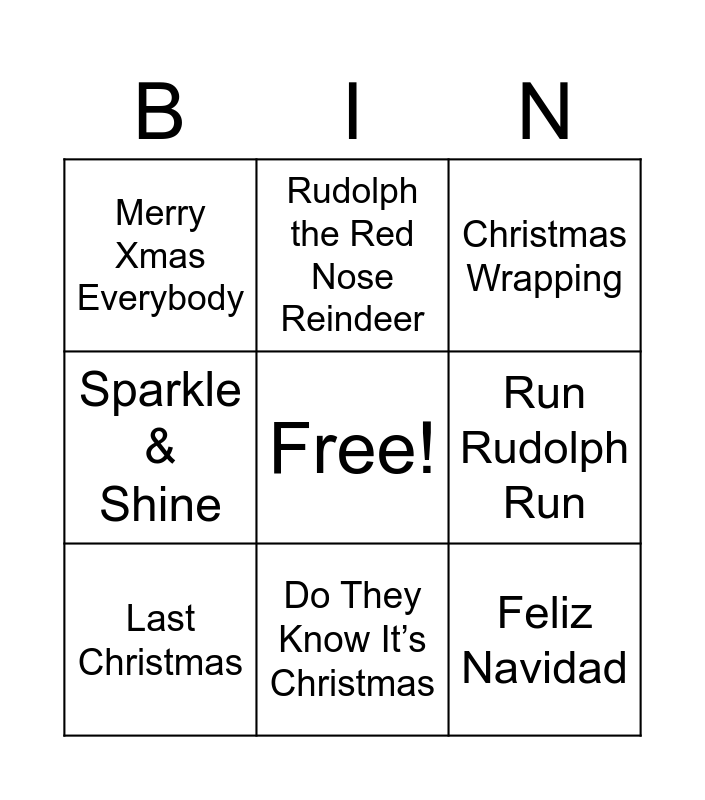 This bingo card has a free space and 41 words: Rockin’ Around The Christmas Tree, All I Want for Christmas Is You, Santa Claus Is Coming To Town, Last Christmas, Wonderful Christmastime, Frosty The Snowman, Do They Know It’s Christmas, Happy Xmas (War Is Over), Feliz Navidad, Step Into Christmas, Nazareth, Sparkle & Shine, It’s Beginning to Look a Lot Like Christmas, One More Sleep, Driving Home for Christmas, Lonely This Christmas, Merry Christmas Everyone, Merry Xmas Everybody, Christmas Time (Don’t Let the Bells End), Christmas Wrapping, Mary’s Boy Child/Oh My Lord, Stay Another Day, Let It Snow! Let It Snow! Let It Snow!, Snowman, Mistletoe and Wine, Christmas Is All Around, Have Yourself a Merry Little Christmas, Do You Want to Build a Snowman, We Wish You a Merry Christmas, Santa Baby, I Wish It Could Be Christmas Everyday, Rudolph the Red Nose Reindeer, Hallelujah, It’s the Most Wonderful Time of the Year, Carol of the Bells, Run Rudolph Run, Deck The Hall, Jingle Bell Rock, What Christmas Means to Me, Joy To The World and Merry Christmas.