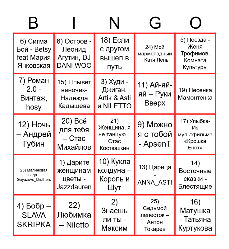 This bingo card has 25 words: 1) Дарите женщинам цветы - Jazzdauren, 2) Знаешь ли ты - Максим, 3) Худи - Джиган, Artik & Asti и NILETTO, 4) Бобр – SLAVA SKRIPKA, 5) Поезда - Женя Трофимов, Комната Культуры, 6) Сигма Бой - Betsy feat Мария Янковская, 7) Роман 2.0 - Винтаж, hosy, 8) Остров - Леонид Агутин, DJ DANI WOO, 9) Можно я с тобой - ApsenT, 10) Кукла колдуна – Король и Шут, 11) Ай-яй-яй – Руки Вверх, 12) Ночь – Андрей Губин, 13) Царица - ANNA_ASTI, 14) Восточные сказки - Блестящие, 15) Плывет веночек- Надежда Кадышева, 16) Матушка - Татьяна Куртукова, 17) Улыбка- Из мультфильма «Крошка Енот», 18) Если с другом вышел в путь, 19) Песенка Мамонтенка, 20) Всё для тебя – Стас Михайлов, 21) Женщина, я не танцую – Стас Костюшкин, 22) Любимка – Niletto, 23) Малиновая лада - Gayazovs_Brothers, 24) Мой мармеладный - Катя Лель and 25) Седьмой лепесток –Антон Токарев.