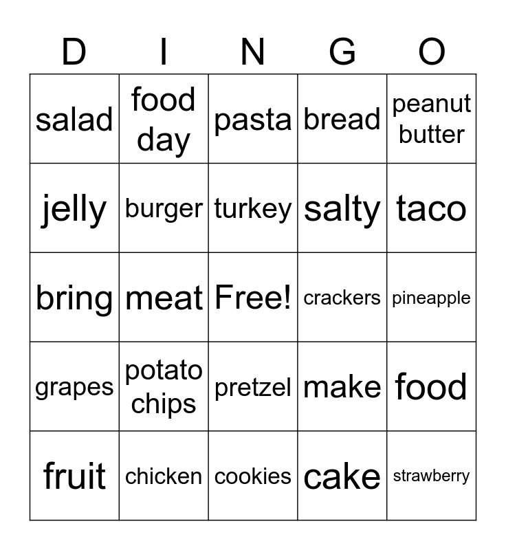 This bingo card has a free space and 29 words: fruit, vegetable, meat, pizza, salad, pasta, burger, potato chips, crackers, chicken, pineapple, strawberry, cookies, cake, taco, sandwich, pretzel, grapes, peanut butter, bring, make, sweet, salty, jelly, bread, food day, food, turkey and pie.