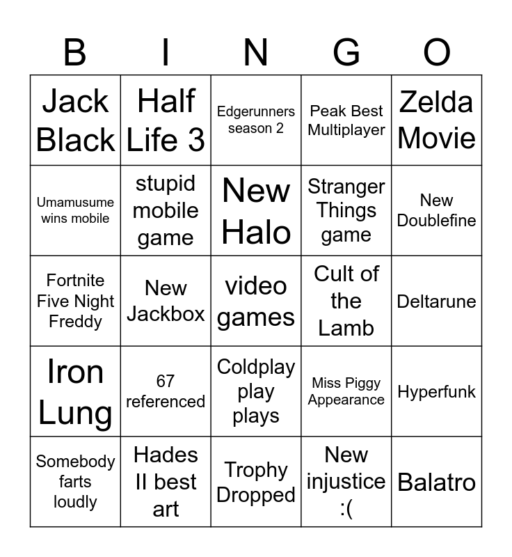This bingo card has a free space and 24 words: 67 referenced, Hades II best art, New Halo, Somebody farts loudly, Zelda Movie, Jack Black, Umamusume wins mobile, Half Life 3, Cult of the Lamb, Coldplay play plays, Stranger Things game, Fortnite Five Night Freddy, Miss Piggy Appearance, Hyperfunk, stupid mobile game, New injustice :(, Deltarune, Edgerunners season 2, New Doublefine, New Jackbox, Balatro, Iron Lung, Peak Best Multiplayer and Trophy Dropped.