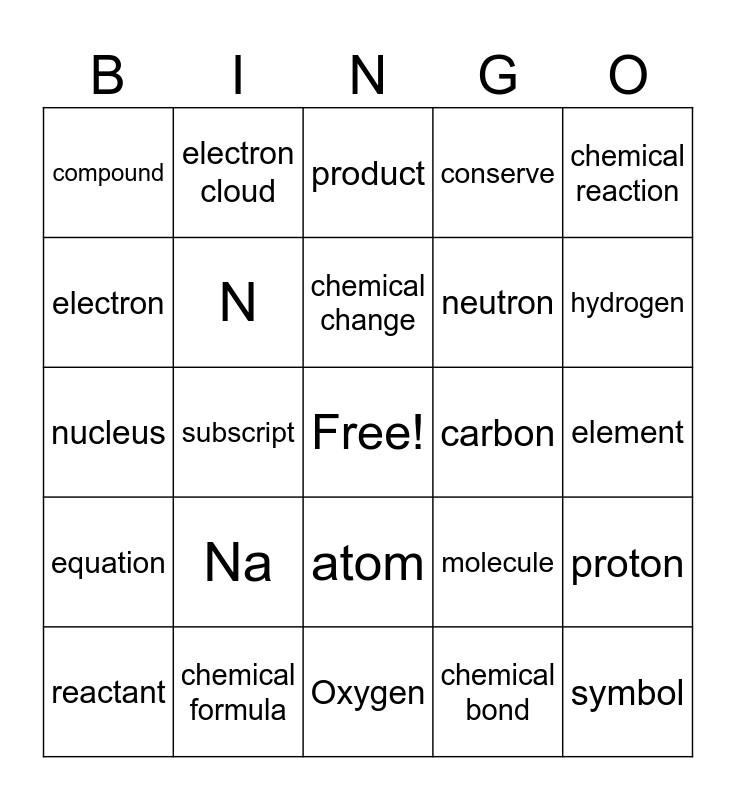 This bingo card has a free space and 26 words: atom, chemical bond, chemical change, chemical formula, chemical reaction, compound, electron, electron cloud, element, molecule, neutron, nucleus, proton, reactant, subscript, charge, conserve, equation, product, symbol, hydrogen, Oxygen, carbon, Na, N and chlorine.