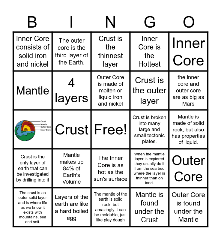 This bingo card has 1 images, a free space and 23 words: Mantle makes up 84% of Earth's Volume, Layers of the earth are like a hard boiled egg, Outer Core is made of molten or liquid iron and nickel, The crust is an outer solid layer and is where life as we know it exists with mountains, sea and soil., Inner Core, Inner Core consists of solid iron and nickel, Mantle, The outer core is the third layer of the Earth., Crust is broken into many large and small tectonic plates., The Inner Core is as hot as the sun's surface, Crust is the outer layer, When the mantle layer is explored they usually do it from the sea bed where the layer is thinner than on land., Outer Core, 4 layers, Mantle is found under the Crust, Mantle is made of solid rock, but also has properties of liquid., Crust is the thinnest layer, the inner core and outer core are as big as Mars, Crust, Outer Core is found under the Mantle, Crust is the only layer of earth that can be investigated by drilling into it, Inner Core is the Hottest and The mantle of the earth is solid rock, but amazingly it can be moldable, just like play dough.