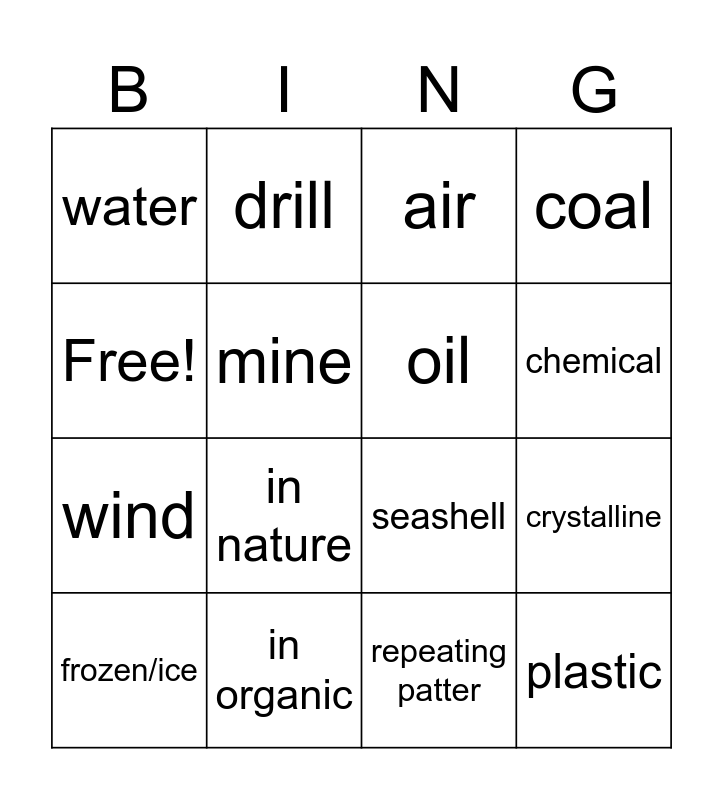 This bingo card has 16 words: in organic, crystalline, air, water, wind, drill, seashell, repeating patter, Free!, mine, frozen/ice, coal, in nature, chemical, oil and plastic.