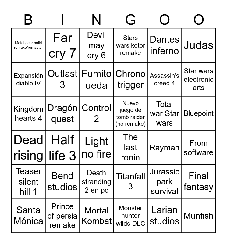 This bingo card has 36 words: Titanfall 3, Death stranding 2 en pc, Monster hunter wilds DLC, Expansión diablo IV, Dead rising, Nuevo juego de tomb raider (no remake), Outlast 3, Mortal Kombat, Dantes inferno, Jurassic park survival, Star wars electronic arts, Stars wars kotor remake, Final fantasy, Dragón quest, Chrono trigger, Metal gear solid remake/remaster, Teaser silent hill 1, Total war Star wars, Kingdom hearts 4, Devil may cry 6, Control 2, Half life 3, The last ronin, Light no fire, Rayman, Far cry 7, Assassin's creed 4, Prince of persia remake, Fumito ueda, Judas, Munfish, Santa Mónica, From software, Bluepoint, Bend studios and Larian studios.