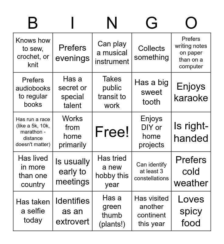 This bingo card has a free space and 44 words: Has a pet, Loves spicy food, Drinks tea daily, Has taken a selfie today, Is left-handed, Has visited another continent this year, Can play a musical instrument, Prefers mornings, Prefers writing notes on paper than on a computer, Identifies as an extrovert, Collects something, Enjoys DIY or home projects, Has tried a new hobby this year, Is usually early to meetings, Drinks coffee daily, Has a green thumb (plants!), Has had the same wallpaper on their phone for over a year, Has run a race (like a 5k, 10k, marathon - distance doesn't matter), Prefers the mountains over the beach, Enjoys karaoke, Prefers evenings, Identifies as an introvert, Has a personal “lucky number”, Knows how to sew, crochet, or knit, Has met someone famous, Is right-handed, Prefers warm weather, Can whistle a tune, Can identify at least 3 constellations, Has lived in more than one country, Knows how to ski or snowboard, Prefers cold weather, Drives a car to work, Listens to podcasts regularly, Works from home primarily, Has had the same wallpaper on their phone for over a year, Prefers regular books to audio books, Knows how to surf or jet ski, Takes public transit to work, Prefers audiobooks to regular books, Has a big sweet tooth, Is usually late to meetings, Has a secret or special talent and Prefers to work in silence.