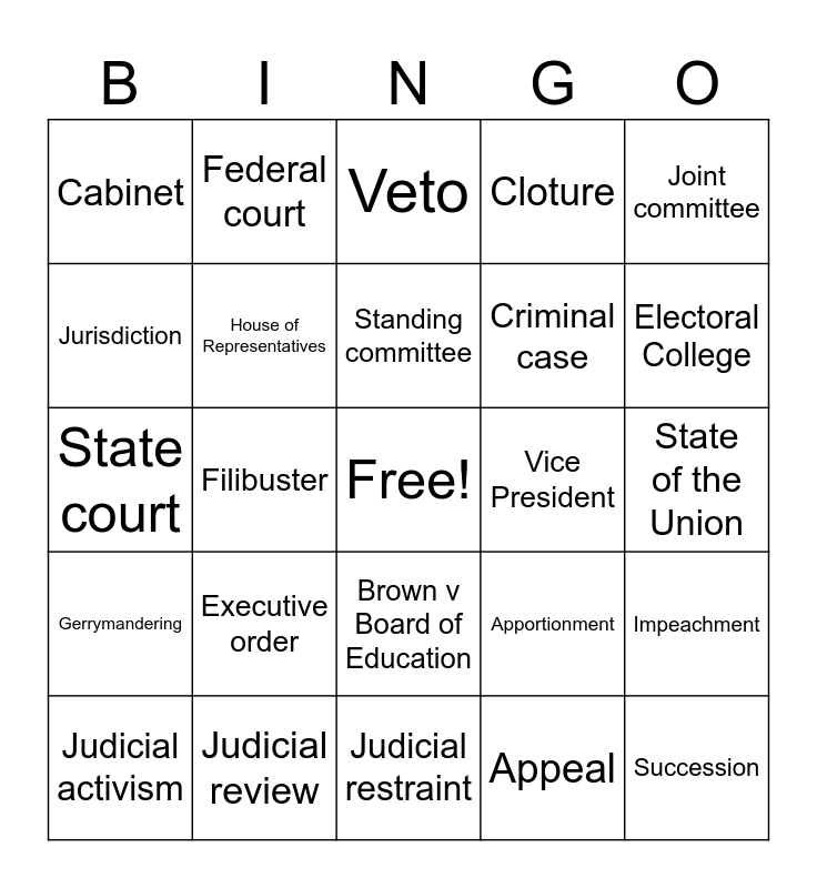 This bingo card has a free space and 36 words: Bicameral, Congress, Senate, House of Representatives, Apportionment, Gerrymandering, Standing committee, Select committee, Joint committee, Speaker of the House, Filibuster, Cloture, President, Vice President, Electoral College, Cabinet, Commander in Chief, Executive order, Succession, Veto, State of the Union, Impeachment, Judicial review, Judicial activism, Judicial restraint, Federal court, State court, Civil case, Criminal case, Jurisdiction, Supreme Court, Trial court, Appeal, Brown v Board of Education, Miranda v Arizona and Engel v Vitale.