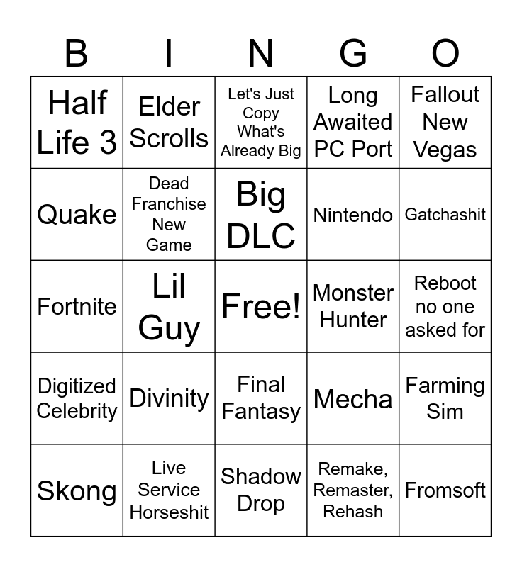 This bingo card has a free space and 24 words: Divinity, Live Service Horseshit, Big DLC, Skong, Fallout New Vegas, Half Life 3, Quake, Elder Scrolls, Monster Hunter, Final Fantasy, Nintendo, Fortnite, Mecha, Farming Sim, Dead Franchise New Game, Remake, Remaster, Rehash, Reboot no one asked for, Let's Just Copy What's Already Big, Gatchashit, Lil Guy, Fromsoft, Digitized Celebrity, Long Awaited PC Port and Shadow Drop.