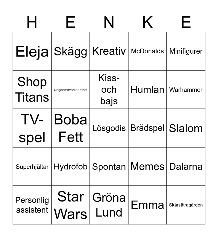 This bingo card has 52 words: Free!, Lösgodis, Skytten, Gröna Lund, Hydrofob, Septumpiercing, Skägg, Hemmakväll, Shop Titans, Slarvig, Ungdomsverksamhet, Lidingö Stad, Dalarna, Memes, Resor, Pappa, Kiss- och bajs, Brädspel, World of Warcraft, Minifigurer, Boba Fett, Emma, Eleja, Humlan, Monster, Skärsätragården, Kaj, Pizza, Warhammer, Stanley, Lat, McDonalds, O'boy, Fritidsledare, Skräck, Kreativ, Star Wars, Borlänge, Lego, The Sims, Fantasy, Slalom, Superhjältar, Halvarsgårdarna, Spontan, Coca-Cola, Lekia, TV-spel, Sollentuna, Gaming, Personlig assistent and Nörd.