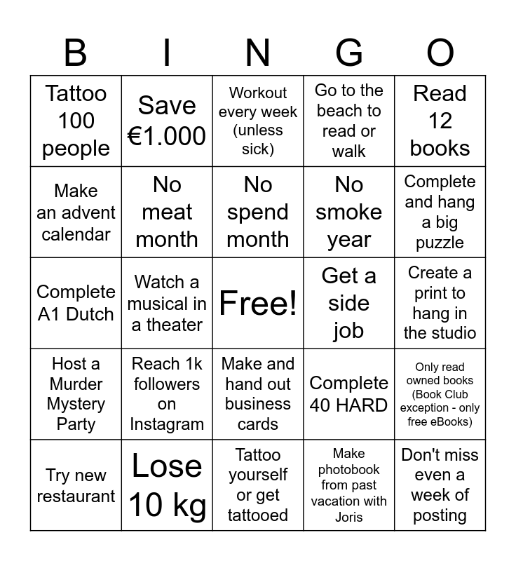This bingo card has a free space and 24 words: Reach 1k followers on Instagram, Lose 10 kg, No spend month, Try new restaurant, Read 12 books, Tattoo 100 people, Make an advent calendar, Save €1.000, Get a side job, Make and hand out business cards, No smoke year, Complete A1 Dutch, Complete 40 HARD, Only read owned books (Book Club exception - only free eBooks), No meat month, Make photobook from past vacation with Joris, Create a print to hang in the studio, Workout every week (unless sick), Complete and hang a big puzzle, Watch a musical in a theater, Don't miss even a week of posting, Host a Murder Mystery Party, Go to the beach to read or walk and Tattoo yourself or get tattooed.