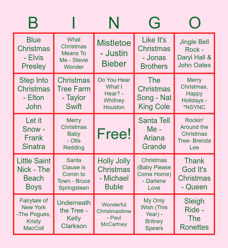 This bingo card has a free space and 29 words: Fairytale of New York -The Pogues, Kristy MacColl, White Christmas - The Drifter, Merry Christmas Baby - Otis Redding, Last Christmas - Wham!, Blue Christmas - Elvis Presley, Mistletoe - Justin Bieber, Christmas Tree Farm - Taylor Swift, Santa Clause is Comin to Town - Bruce Springsteen, Santa Tell Me -Ariana Grande, Underneath the Tree - Kelly Clarkson, Rockin' Around the Christmas Tree- Brenda Lee, Sleigh Ride - The Ronettes, Wonderful Christmastime - Paul McCartney, My Only Wish (This Year) - Britney Spears, Merry Christmas, Happy Holidays - *NSYNC, All I Want for Christmas Is You - Mariah Carey, Holly Jolly Christmas - Michael Buble, Little Saint Nick - The Beach Boys, Jingle Bell Rock - Daryl Hall & John Oates, Let it Snow - Frank Sinatra, Christmas (Baby Please Come Home) - Darlene Love, Feliz Navidad- Jose Feliciano, The Christmas Song - Nat King Cole, Step Into Christmas - Elton John, Like It's Christmas - Jonas Brothers, What Christmas Means To Me - Stevie Wonder, Thank God It's Christmas - Queen, Do You Hear What I Hear? - Whitney Houston and Christmas Eve/Sarajevo 12/24 - Trans-Siberian Orchestra.