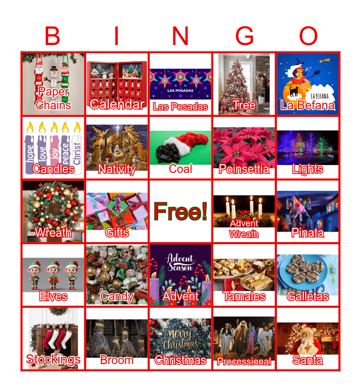 This bingo card has 24 images, a free space and 24 words: Candy, Broom, Coal, Stockings, La Befana, Paper Chains, Candles, Calendar, Advent Wreath, Advent, Poinsettia, Wreath, Tamales, Galletas, Nativity, Processional, Pinata, Las Posadas, Lights, Gifts, Santa, Elves, Tree and Christmas.