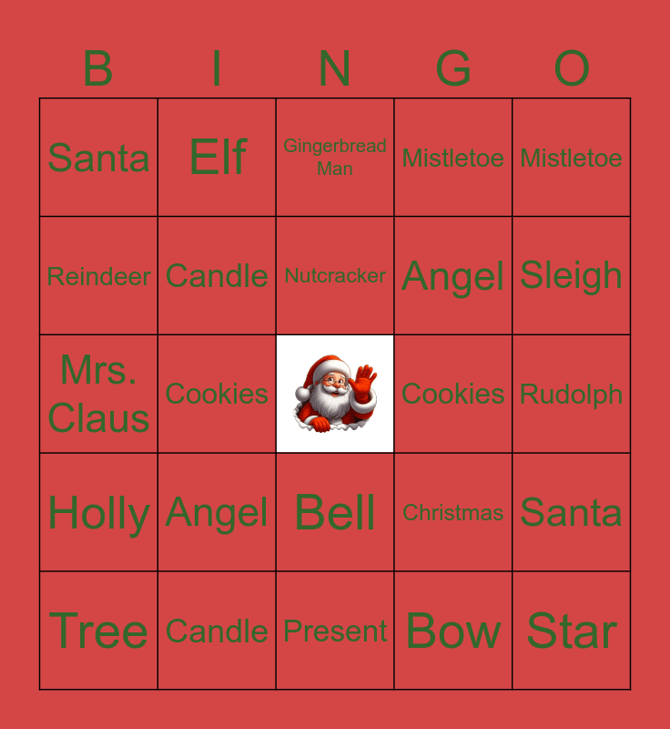 ⚠ This card has duplicate items: Candy Cane (2), Holly (2), Bow (2), Wreath (2), Bell (2), North Pole (2), Mistletoe (3), Gingerbread Man (2), Reindeer (2), Mrs. Claus (2), Santa (2), Lights (2), Candle (2), Tree (2), Ornament (2), Present (2), Star (2), Angel (2), Nativity (2), Rudolph (2), Christmas (2), Nutcracker (2), Cookies (2), Sleigh (2), Elf (2), Snow (2)