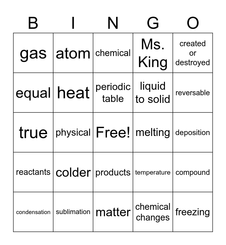 This bingo card has a free space and 29 words: condensation, yes, physical, solid, gas, chemical, heat, colder, melting, sublimation, deposition, freezing, matter, chemical changes, reversable, liquids, products, reactants, created or destroyed, true, temperature, gas to liquid, liquid to solid, equal, Ms. King, atom, compound, periodic table and heat.