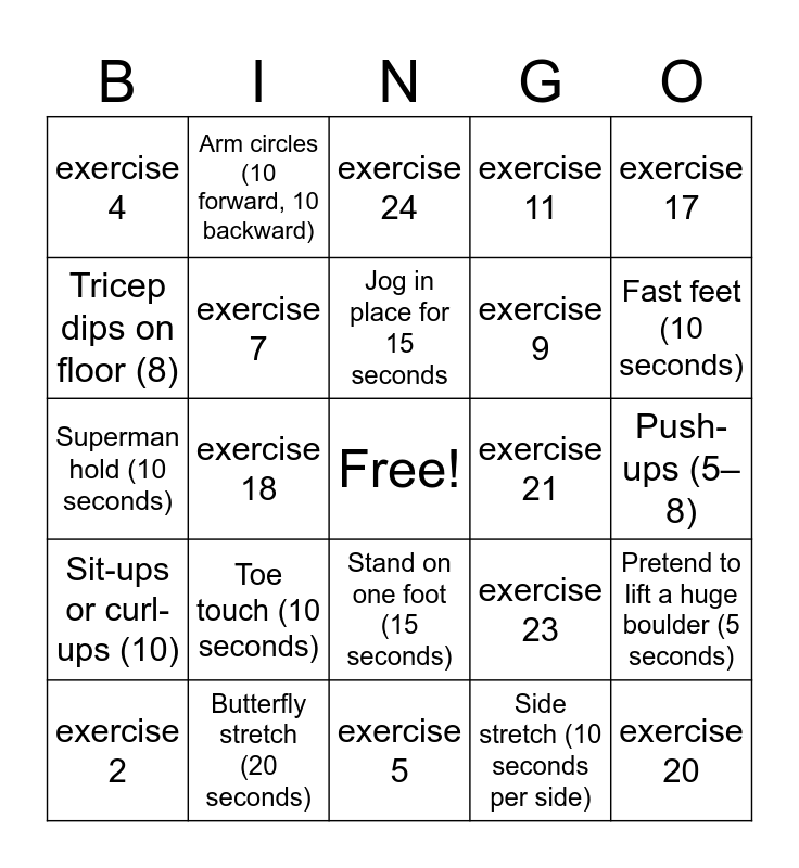 This bingo card has a free space and 57 words: exercise 1, exercise 2, exercise 3, exercise 4, exercise 5, exercise 6, exercise 7, exercise 8, exercise 9, exercise 10, exercise 11, exercise 12, exercise 13, exercise 14, exercise 15, exercise 16, exercise 17, exercise 18, exercise 19, exercise 20, exercise 21, exercise 22, exercise 23, exercise 24, exercise 25, Jog in place for 15 seconds, Jumping jacks (10), High knees in place (15 seconds), Fast feet (10 seconds), Pretend jump rope (20 jumps), Invisible hula hoop (10 seconds), Mountain climbers (10–15), Star jumps (5), Squats (10), Push-ups (5–8), Tricep dips on floor (8), Plank (15 seconds), Superman hold (10 seconds), Wall sit (15–20 seconds), Sit-ups or curl-ups (10), Arm circles (10 forward, 10 backward), Stand on one foot (15 seconds), Airplane balance (10 seconds), Tree pose (10 seconds), Stand with eyes closed (10 seconds), Tabletop pose (hold 15 seconds), Toe touch (10 seconds), Butterfly stretch (20 seconds), Reach up tall and hold (10 seconds), Arm across chest stretch (10 seconds), Cat/Cow (5 slow reps), Side stretch (10 seconds per side), Silent jumping jacks (5), Make a muscle pose (hold 5 seconds), Wiggle arms then freeze (5 seconds), Pretend to lift a huge boulder (5 seconds) and Balance on tiptoes (10 seconds).