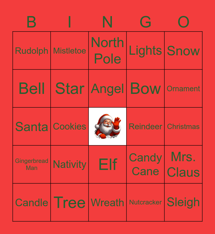 This bingo card has a free space and 27 words: Candy Cane, Holly, Bow, Wreath, Bell, North Pole, Mistletoe, Gingerbread Man, Reindeer, Mrs. Claus, Santa, Lights, Candle, Tree, Ornament, Present, Star, Angel, Nativity, Rudolph, Christmas, Nutcracker, Cookies, Sleigh, Elf, Snow and Hot Cocoa.