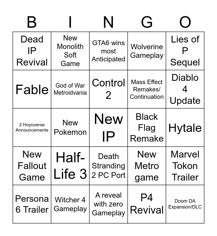 This bingo card has a free space and 24 words: Half-Life 3, Witcher 4 Gameplay, Control 2, Persona 6 Trailer, Lies of P Sequel, Dead IP Revival, Fable, New Monolith Soft Game, Black Flag Remake, Death Stranding 2 PC Port, Mass Effect Remakes/ Continuation, 2 Hoyoverse Announcements, New Metro game, Marvel Tokon Trailer, God of War Metroidvania, P4 Revival, Hytale, GTA6 wins most Anticipated, Diablo 4 Update, New Pokemon, Doom DA Expansion/DLC, New Fallout Game, Wolverine Gameplay and A reveal with zero Gameplay.