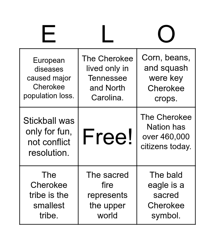 This bingo card has a free space and 9 words: The Cherokee tribe is the smallest tribe., The Cherokee lived only in Tennessee and North Carolina., The Cherokee Nation has over 460,000 citizens today., European diseases caused major Cherokee population loss., Corn, beans, and squash were key Cherokee crops., Stickball was only for fun, not conflict resolution., The sacred fire represents the upper world, The bald eagle is a sacred Cherokee symbol. and The Kituwah Mound is the Cherokee “mother town.”.