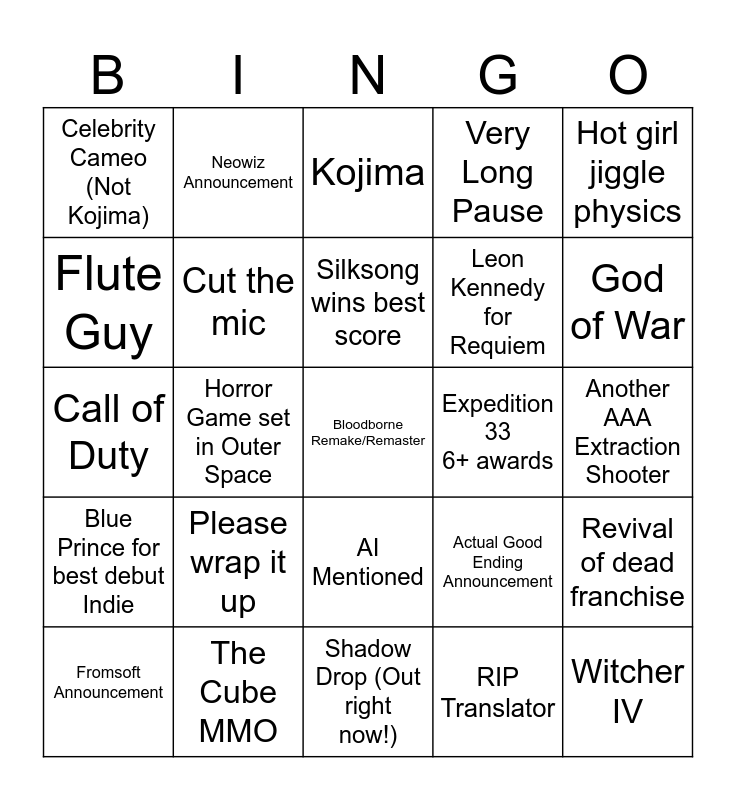 This bingo card has a free space and 24 words: Please wrap it up, The Cube MMO, Silksong wins best score, Fromsoft Announcement, Hot girl jiggle physics, Celebrity Cameo (Not Kojima), Flute Guy, Neowiz Announcement, Expedition 33 6+ awards, AI Mentioned, Leon Kennedy for Requiem, Call of Duty, Actual Good Ending Announcement, Revival of dead franchise, Cut the mic, RIP Translator, Another AAA Extraction Shooter, Kojima, God of War, Horror Game set in Outer Space, Witcher IV, Blue Prince for best debut Indie, Very Long Pause and Shadow Drop (Out right now!).