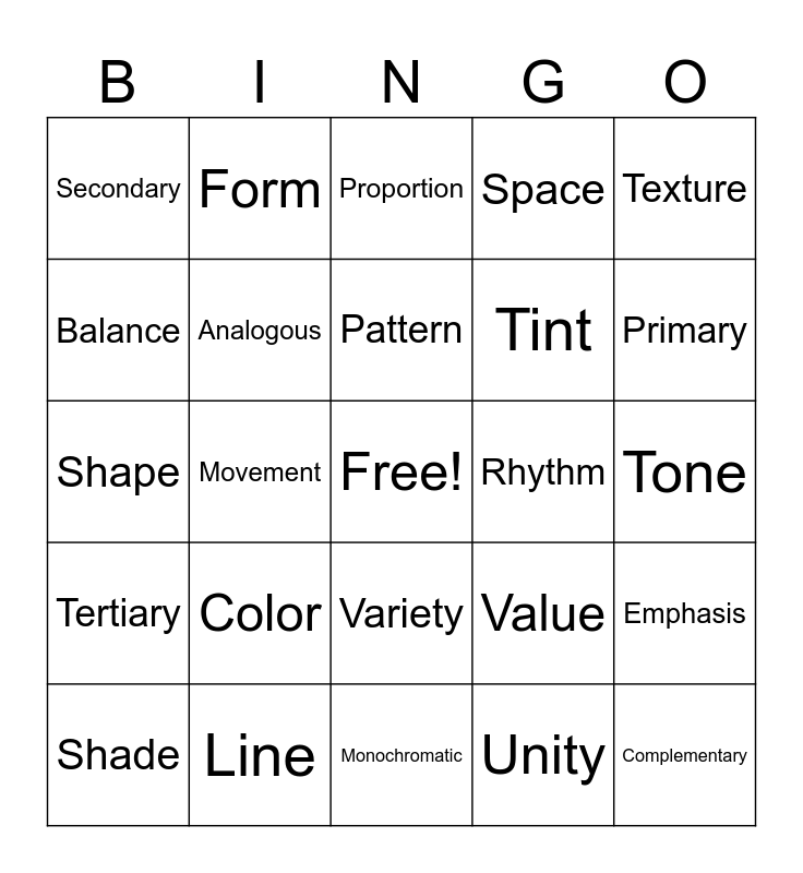This bingo card has a free space and 24 words: Color, Line, Pattern, Shade, Texture, Secondary, Balance, Form, Rhythm, Variety, Tint, Shape, Value, Emphasis, Analogous, Unity, Tone, Proportion, Primary, Movement, Complementary, Tertiary, Space and Monochromatic.