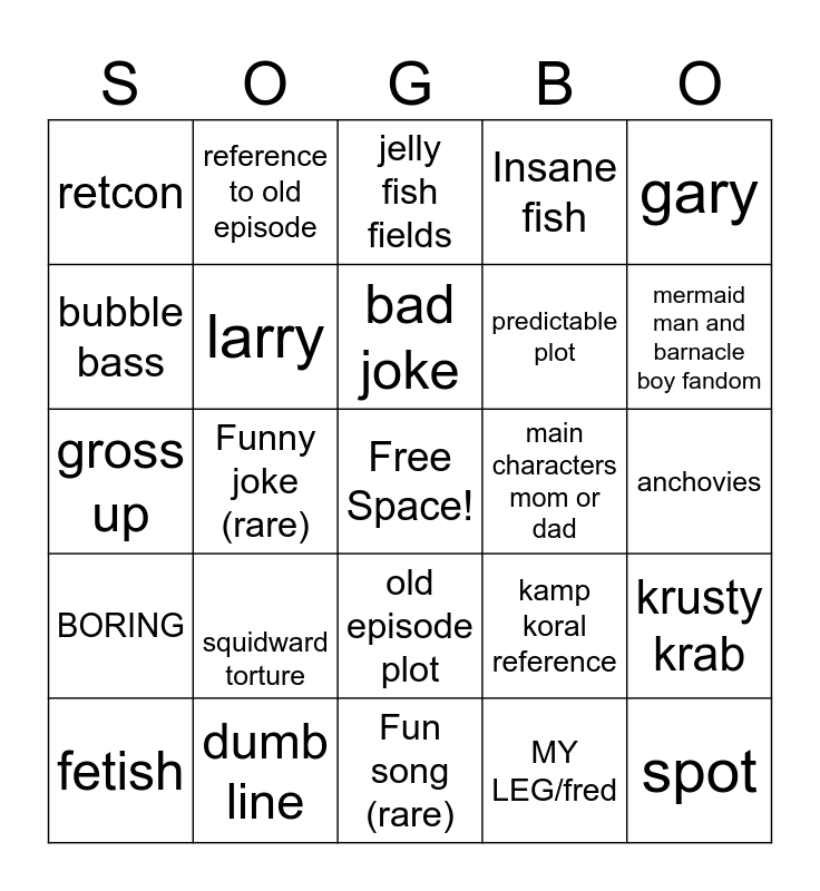 This bingo card has a free space and 24 words: squidward torture, dumb line, bad joke, fetish, gary, retcon, bubble bass, reference to old episode, main characters mom or dad, old episode plot, predictable plot, gross up, kamp koral reference, krusty krab, larry, MY LEG/fred, anchovies, jelly fish fields, mermaid man and barnacle boy fandom, Funny joke (rare), spot, BORING, Insane fish and Fun song (rare).