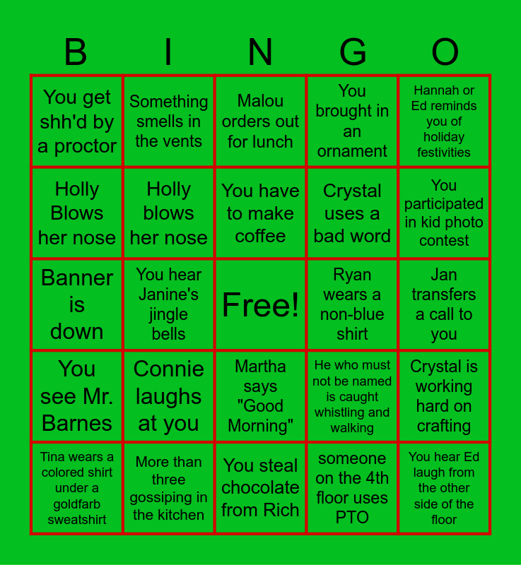 This bingo card has a free space and 29 words: Tina wears a colored shirt under a goldfarb sweatshirt, Kelly is seen storytellin at a door, You hear Janine's jingle bells, You attend commencement, You get shh'd by a proctor, Malou orders out for lunch, Holly blows her nose, Connie laughs at you, Ryan wears a non-blue shirt, More than three gossiping in the kitchen, Jan transfers a call to you, You hear Ed laugh from the other side of the floor, You steal chocolate from Rich, someone on the 4th floor uses PTO, You participated in kid photo contest, Tina reminds you of Commencement, Martha says "Good Morning", You see Mr. Barnes, Hannah or Ed reminds you of holiday festivities, Banner is down, He who must not be named is caught whistling and walking, Joe says hi, Crystal uses a bad word, Holly Blows her nose, You brought in an ornament, Something smells in the vents, Crystal is working hard on crafting, You have to make coffee and You post in the 4th floor chat.
