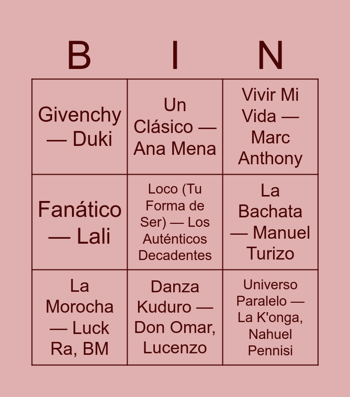 This bingo card has 57 words: Free!, Shakira: Bzrp Music Sessions, Vol. 53 — Bizarrap, Shakira, Corazón Vacío — Maria Becerra, Givenchy — Duki, La Triple T — TINI, Cuatro Veinte — Emilia, La Morocha — Luck Ra, BM, Ya No Vuelvas (Versión Cuarteto) — Luck Ra, La K'onga, Ke Personajes, Universo Paralelo — La K'onga, Nahuel Pennisi, Ni Una Ni Dos — BM, Fanático — Lali, Entre Nosotros — Tiago PZK, LIT killah, 8 AM — Nicki Nicole, Young Miko, Perfecta (Versión 2023) — Miranda!, Maria Becerra, FMK, Rara Vez — Milo j, Taiu, Antes y Después — Ciro y los Persas, Loco (Tu Forma de Ser) — Los Auténticos Decadentes, La Suavecita — Los Palmeras, Soledad, Es Tan Grande Este Amor — Rodrigo Tapari, Hola Precioso — El Kuelgue, Mi Manera de Ser — Bandalos Chinos, Bailando (Spanish Version) — Enrique Iglesias, Descemer Bueno, Gente de Zona, Vente Pa’ Ca (feat. Maluma) — Ricky Martin, Maluma, Vivir Mi Vida — Marc Anthony, Gasolina — Daddy Yankee, Danza Kuduro — Don Omar, Lucenzo, Despechá — Rosalía, Me Niego (feat. Ozuna & Wisin) — Reik, Ozuna, Wisin, El Perdón — Nicky Jam, Enrique Iglesias, Felices los 4 — Maluma, Classy 101 — Feid, Young Miko, Where She Goes — Bad Bunny, Punto 40 — Rauw Alejandro, Baby Rasta, Provenza — Karol G, TQG — Karol G, Shakira, La Bachata — Manuel Turizo, LALA — Myke Towers, Hey Mor — Ozuna, Feid, Vagabundo — Sebastián Yatra, Manuel Turizo, Beéle, Según Quién — Maluma, Carín León, Un Clásico — Ana Mena, Qué le pasa conmigo? — Nicki Nicole, Rels B, Columbia — Quevedo, De lunes a lunes — Manuel Turizo, Grupo Frontera, All I Want for Christmas Is You — Mariah Carey, Last Christmas — Wham!, Feliz Navidad — José Feliciano, It’s Beginning to Look a Lot Like Christmas — Michael Bublé, Rockin’ Around the Christmas Tree — Brenda Lee, Do They Know It’s Christmas? (1984 Version) — Band Aid, Santa Claus Llegó a la Ciudad — Luis Miguel, Santa Tell Me — Ariana Grande, Wonderful Christmastime — Paul McCartney, Happy Xmas (War Is Over) — John Lennon, Yoko Ono, El Burrito Sabanero — David Bisbal, DUMBAI — CA7RIEL & Paco Amoroso and El Único — CA7RIEL & Paco Amoroso.