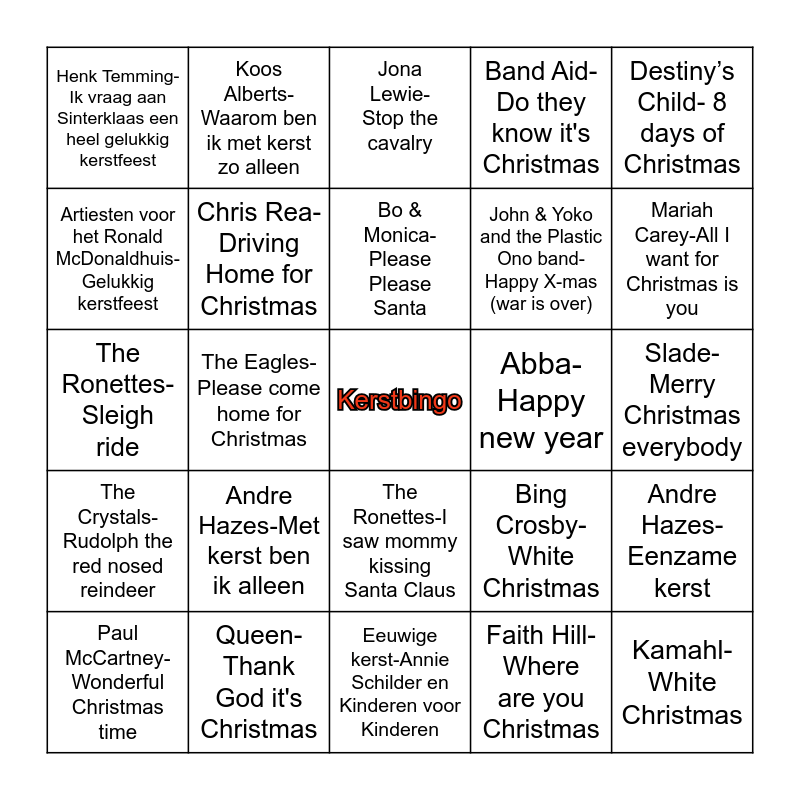 This bingo card has a free space and 46 words: Mud- Lonely this Christmas, Kamahl-White Christmas, Een heel gelukkig kerstfeest-diverse artiesten, Eeuwige kerst-Annie Schilder en Kinderen voor Kinderen, Andre Hazes-Met kerst ben ik alleen, Last Cristmas-Wham, Koos Alberts-Waarom ben ik met kerst zo alleen, Paul mcCartney-Once upon a long ago, Artiesten voor het Ronald McDonaldhuis-Gelukkig kerstfeest, Fay Lovsky-Christmas was a Friend of mine, Chris Rea-Driving Home for Christmas, Band Aid-Do they know it's Christmas, Andre Hazes-Eenzame kerst, Bing Crosby-White Christmas, Katie Melua-Have yourself a merry little Christmas, Bianca Ryan-Why couldn't it be Christmas every day, Bo & Monica-Please Please Santa, Abba-Happy new year, de Tokkies-Verre kerst, Destiny’s Child- 8 days of Christmas, The Eagles-Please come home for Christmas, Faith Hill-Where are you Christmas, Henk Temming-Ik vraag aan Sinterklaas een heel gelukkig kerstfeest, John & Yoko and the Plastic Ono band-Happy X-mas (war is over), Kenny Rogers en Dolly Parton-Christmas without you, Mariah Carey-All I want for Christmas is you, Paul McCartney-Wonderful Christmas time, The Crystals-Santa Claus is coming to town, The Ronettes-I saw mommy kissing Santa Claus, The Crystals-Rudolph the red nosed reindeer, Darlene Love-Christmas (Baby please come home), Darlene Love-White Christmas, Bob B Soxx and the bleu jeans-Here comes Santa Claus, Procol Harum-Christmas Camel, , The Who-Christmas, Queen-Thank God it's Christmas, Slade-Merry Christmas everybody, The Pretenders-2000 miles, Trijntje Oosterhuis-Merry Christmas baby, Daniel Lohues & Herman Finkers-Sneeuwen, Kus-Kon het elke dag maar kerstmis zijn, Jona Lewie-Stop the cavalry, The Ronettes-Sleigh ride, Miss Montreal-Being alone at Christmas, Boney M-Mary’s boy child/Oh my lord and Harry Jekkers-de kerstezel.