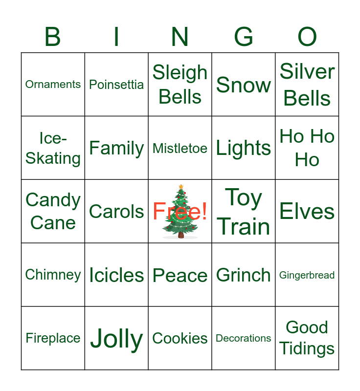 This bingo card has a free space and 55 words: Stocking, Fireplace, Christmas Tree, Ornaments, Cookies, Hot Cocoa, Family, Gifts, Lights, Garland, Snow, Snowman, Jingle Bells, Hanukkah, Menorah, Candles, Silver Bells, Carols, Celebration, Good Tidings, Toy Train, Polar Express, Grinch, Sleigh Bells, Santa, Mistletoe, Decorations, Reindeer, Elves, Gingerbread, Holly, Wreath, Gift-Wrapping, Shopping, Ice-Skating, Candy Cane, Eggnog, Chimney, Snowflake, Noel, Poinsettia, Frosty, Scrooge, Tradition, Icicles, Jolly, Cards, Nutcracker, St. Nick, Ho Ho Ho, Flannel, Cozy, December, Peace and Snowball.