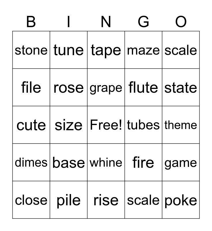 This bingo card has a free space and 24 words: base, pile, grape, close, scale, stone, file, tune, tubes, whine, flute, cute, fire, game, rose, scale, theme, tape, state, size, poke, dimes, maze and rise.