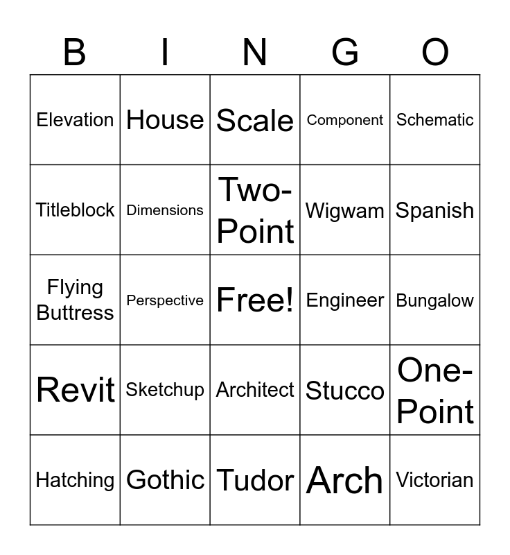 This bingo card has a free space and 30 words: Gothic, Gable, Perspective, Offset, Elevation, Scale, Dimensions, Architect, Engineer, Tudor, Bungalow, Victorian, Arch, Isometric, Spanish, Clay, Stucco, Revit, Sketchup, Schematic, Flying Buttress, Floorplan, House, Wigwam, Titleblock, Component, One-Point, Hatching, Two-Point and Level.