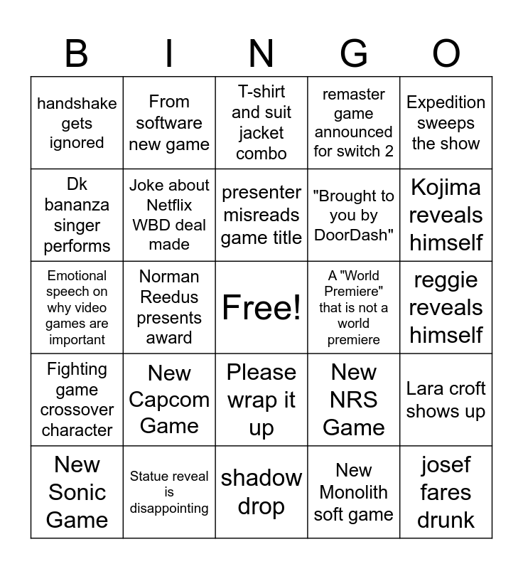 This bingo card has a free space and 24 words: New Capcom Game, Statue reveal is disappointing, presenter misreads game title, New Sonic Game, Expedition sweeps the show, handshake gets ignored, Dk bananza singer performs, From software new game, A "World Premiere" that is not a world premiere, Please wrap it up, "Brought to you by DoorDash", Emotional speech on why video games are important, New NRS Game, Lara croft shows up, Joke about Netflix WBD deal made, New Monolith soft game, reggie reveals himself, T-shirt and suit jacket combo, Kojima reveals himself, Norman Reedus presents award, josef fares drunk, Fighting game crossover character, remaster game announced for switch 2 and shadow drop.