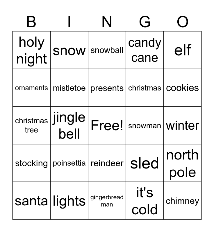 This bingo card has a free space and 24 words: poinsettia, lights, presents, santa, elf, holy night, ornaments, snow, snowman, reindeer, christmas, christmas tree, sled, north pole, mistletoe, it's cold, winter, snowball, cookies, jingle bell, chimney, stocking, candy cane and gingerbread man.