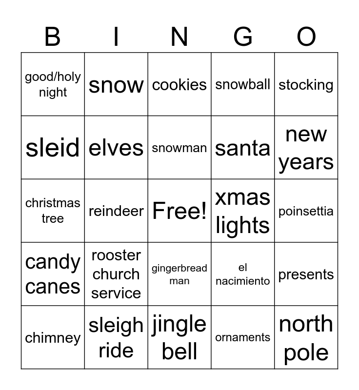 This bingo card has a free space and 24 words: rooster church service, sleigh ride, snowman, chimney, stocking, good/holy night, sleid, snow, xmas lights, gingerbread man, santa, christmas tree, el nacimiento, presents, elves, ornaments, poinsettia, cookies, new years, reindeer, north pole, candy canes, snowball and jingle bell.