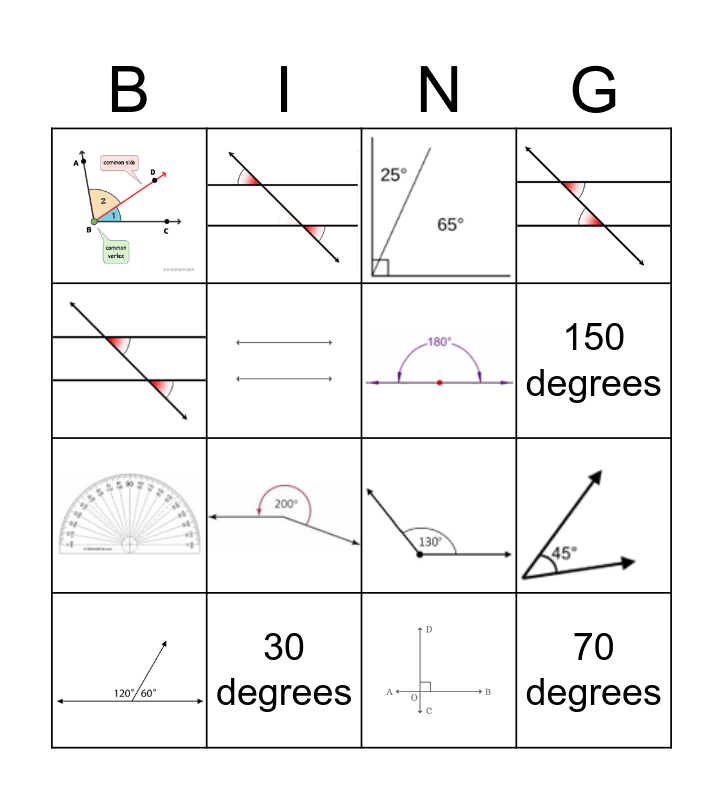 This bingo card has 17 images and 3 words: 30 degrees, 70 degrees and 150 degrees.