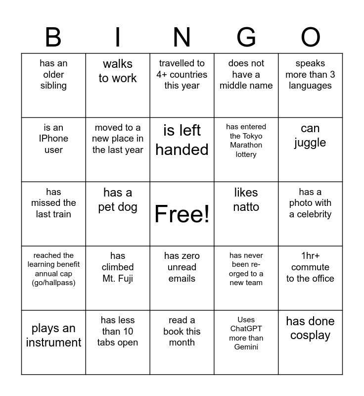 This bingo card has a free space and 24 words: plays an instrument, has climbed Mt. Fuji, is left handed, Uses ChatGPT more than Gemini, speaks more than 3 languages, has an older sibling, walks to work, travelled to 4+ countries this year, likes natto, has a photo with a celebrity, has missed the last train, moved to a new place in the last year, has never been re-orged to a new team, 1hr+ commute to the office, is an IPhone user, has less than 10 tabs open, read a book this month, does not have a middle name, can juggle, reached the learning benefit annual cap (go/hallpass), has a pet dog, has zero unread emails, has entered the Tokyo Marathon lottery and has done cosplay.