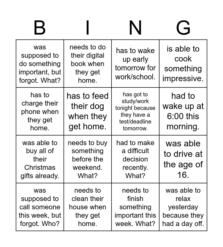 This bingo card has 16 words: needs to clean their house when they get home., was able to drive at the age of 16., has to wake up early tomorrow for work/school., was supposed to do something important, but forgot. What?, was able to buy all of their Christmas gifts already., needs to do their digital book when they get home., had to make a difficult decision recently. What?, needs to finish something important this week. What?, has to charge their phone when they get home., has to feed their dog when they get home., was supposed to call someone this week, but forgot. Who?, is able to cook something impressive., needs to buy something before the weekend. What?, had to wake up at 6:00 this morning., has got to study/work tonight because they have a test/deadline tomorrow. and was able to relax yesterday because they had a day off..